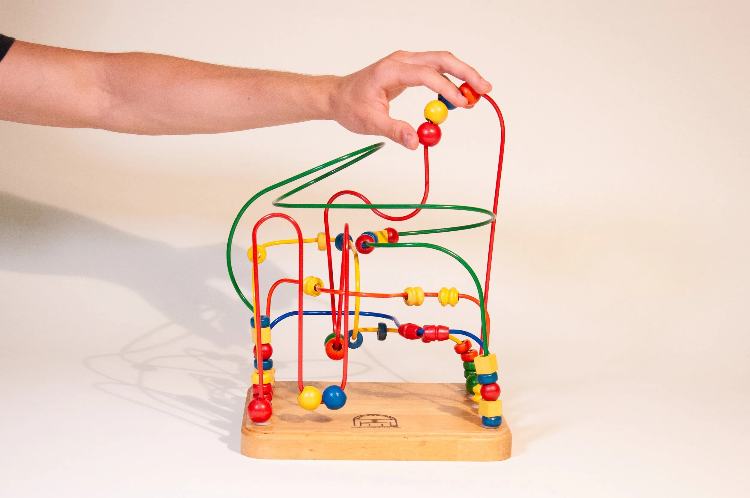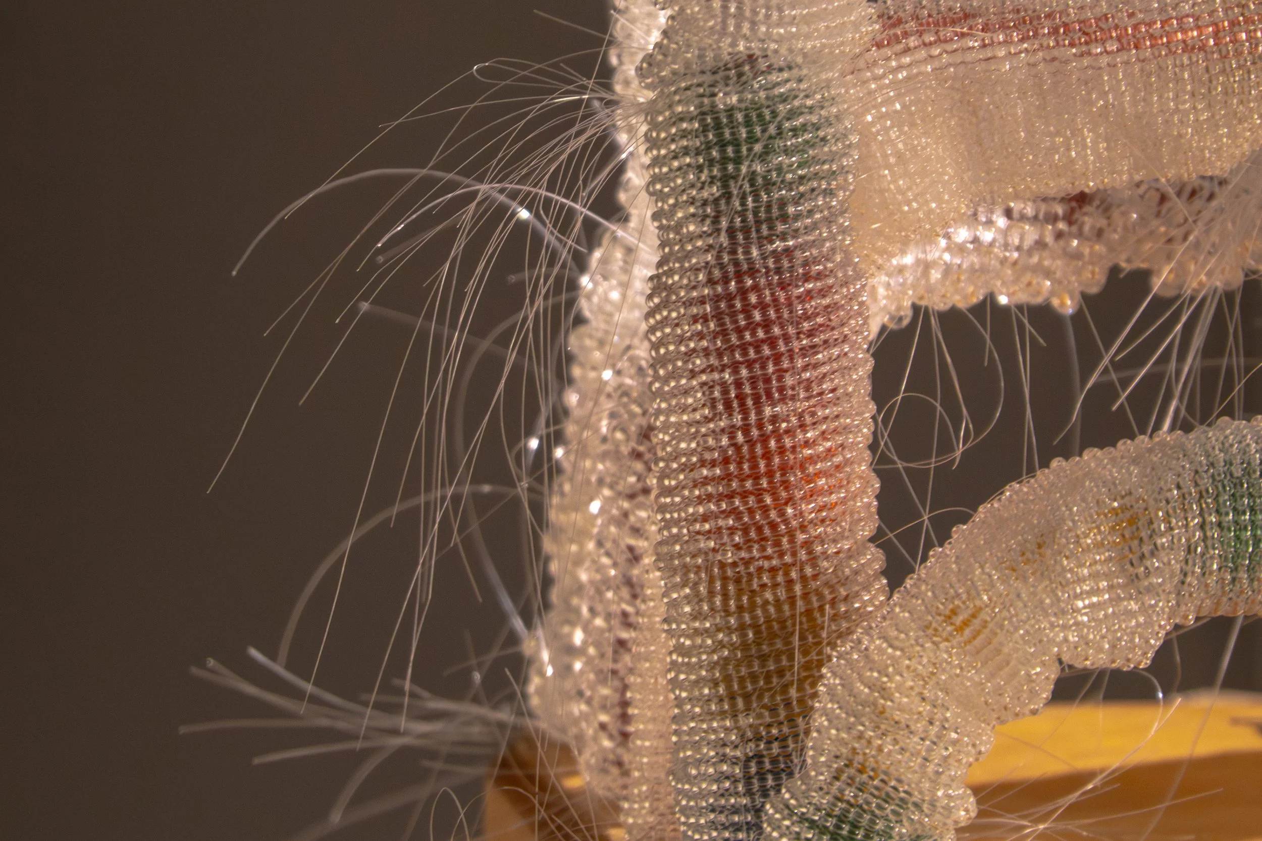 Abacus consists of a second hand abacus and twenty seven beaded tapestries totaling 70,000 Czech glass beads. The weaving required an estimated 500 hours, a durational performance that treats time as currency. This repetitive labor mirrors how we process trauma and memory. The glass beads both beautify and immobilize the counting frame, crystallizing it into dysfunction. Installed as foam sleeve packaging, these glass tapestries cover and protect the rods while remaining more fragile than the object itself. The beaded sleeves read as uncountable tears, could be of sadness or joy; or as parasitic, intestine like forms; structural threads are left uncut to emphasize decomposition and danger. The abacus accommodates the individual’s experience, equally sad and joyful, repulsive and beautiful, intimidating and familiar.